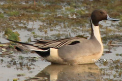 The pintail or northern pintail (Anas acuta) is a duck with wide geographic distribution that breeds in the northern areas of Europe, Asia and North America. It is migratory and winters south of its breeding range to the equator. Unusually for a bird with such a large range, it has no geographical subspecies if the possibly conspecific duck Eaton's pintail is considered ...more ↓