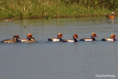 The red-crested pochard (Netta rufina) is a large diving duck. The scientific name is derived from Greek Netta "duck", and Latin rufina, "golden-red" (from rufus, "ruddy"). Its breeding habitat is lowland marshes and lakes in southern Europe and Central Asia, wintering in the Indian Subcontinent and Africa. It is somewhat migratory, and northern birds winter ...more ↓