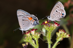 Color: One tail on hindwing. Upperside blue-gray with large red spot near tail. Underside of spring/fall form is dark gray, summer form is paler gray. Relatively straight postmedian line is white, bordered with orange on the inside edge.