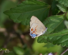 Color: Upper surface of hindwing iridescent blue or blue-green. Underside of hindwing with submarginal row of 7 round orange spots in iridescent blue field.