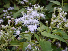 Ageratum conyzoides (billygoat-weed, chick weed, goatweed, whiteweed) is native to Tropical America, especially Brazil, and considered an invasive weed in many other regions. It is an herb that is 0.5–1 m. high, with ovate leaves 2–6 cm long, and flowers are white to mauve.