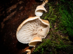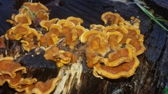 Stereum hirsutum, also called false turkey tail, is a fungus typically forming multiple brackets on dead wood. It is also a plant pathogen infecting peach trees. S. hirsutum is in turn parasitised by certain other species such as the fungus Tremella aurantia. Substrates for S. hirsutum include dead limbs and trunks of both hardwoods and conifers.