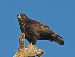 The Ferruginous Hawk (ferruginous = from Latin ferrum – iron, ferrgin-, iron rust, iron-rust color – reddish-brown), Buteo regalis (Latin, royal hawk), is a large bird of prey and belongs to the broad-winged buteo hawks. An old colloquial name is "Ferrugineous Rough-leg", due to its similarity to the closely related Rough-legged Hawk (B. ...more ↓