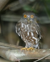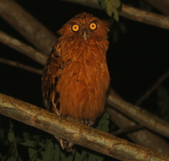 The Oriental Bay Owl (Phodilus badius) is a type of bay owl, usually classified with barn owls. It is completely nocturnal, and can be found throughout Southeast Asia. It has several subspecies. It has a heart-shaped face with earlike extensions. The Congo Bay Owl (Phodilus prigoginei) was formerly classified as a subspecies of Oriental Bay Owl due to insufficient ...more ↓