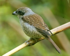 The Brown Shrike (Lanius cristatus) is a bird in the shrike family that is found mainly in Asia. It is closely related to the Red-backed Shrike (L. collurio) and Isabelline Shrike (L. isabellinus). Like most other shrikes, it has a distinctive black "bandit-mask" through the eye. and is found mainly in open scrub habitats, where it perches on the tops of thorny ...more ↓