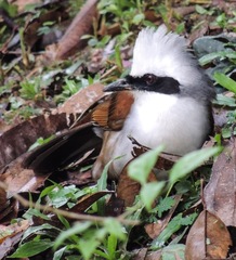 The White-crested Laughingthrush (Garrulax leucolophus) is a member of the Timaliidae family. It is found in forest and scrub from the Himalayan foothills to Indochina. It formerly included the Sumatran Laughingthrush as a subspecies, but unlike that species the plumage of the White-crested Laughingthrush is rufescent-brown and white, and the black mask is relatively broad.