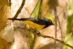 The Sultan Tit (Melanochlora sultanea) is a large songbird (about 17 cm long) with a yellow crest, dark bill, black upperparts plumage and yellow underparts. The sexes are similar. The female has greenish black upperparts and yellowish throat. The young bird is duller than the adult and has a shorter crest. It is the only member of the monotypic genus Melanochlora, ...more ↓