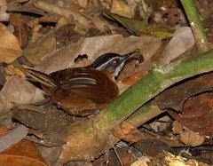 The Rail-babbler or Malaysian Rail-babbler (Eupetes macrocerus) is a strange, rail-like, brown and pied inhabitant of the floor of primary forest in the Malay Peninsula and Sumatra (the nominate subspecies macrocerus), as well as Borneo (ssp. borneensis), distantly related to African crow-like birds. Its population has greatly decreased because much of the ...more ↓