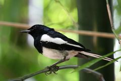 The Oriental Magpie-Robin (Copsychus saularis) is a small passerine bird that was formerly classed as a member of the thrush family Turdidae, but now considered an Old World flycatcher. They are distinctive black and white birds with a long tail that is held upright as they forage on the ground or perch conspicuously. Occurring across most of the Indian Subcontinent and parts of ...more ↓