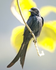 The Greater Racket-tailed Drongo (Dicrurus paradiseus) is a medium-sized Asian bird which is distinctive in having elongated outer tail feathers with webbing restricted to the tips. They are placed along with other drongos in the family Dicruridae. They are conspicuous in the forest habitats often perching in the open and by attracting attention with a wide range of loud calls ...more ↓