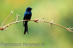 The Black Drongo (Dicrurus macrocercus) is a small Asian passerine bird of the drongo family Dicruridae. It is a common resident breeder in much of tropical southern Asia from southwest Iran through India and Sri Lanka east to southern China and Indonesia. It is a wholly black bird with a distinctive forked tail and measures 28 cm (11 in) in length. Feeding on insects, it is ...more ↓