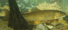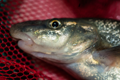 The longnose dace (Rhinichthys cataractae) is a freshwater minnow native to North America. Rhinicthys means snout fish (reference to the long snout) and catarace means of the cataract (first taken from Niagara Falls). Longnose dace are small, typically less than 100 mm and characterized by their fleshy snout that protrudes past the mouth. They are well adapted for ...more ↓