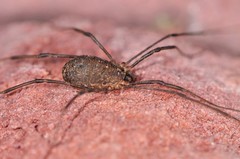 Phalangium opilio is "the most widespread species of harvestman in the world", occurring natively in Europe, and much of Asia, and having been introduced to North America, North Africa and New Zealand. It is found in a wide range of habitats, including meadows, bogs, forests, and various types of anthropogenic habitats, such as gardens, fields, hedgerows, lawns, quarries, green ...more ↓