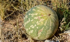 Watermelon (Citrullus lanatus (Thunb.), family Cucurbitaceae) is a vine-like (scrambler and trailer) flowering plant originally from southern Africa. Its fruit, which is also called watermelon, is a special kind referred to by botanists as a pepo, a berry which has a thick rind (exocarp) and fleshy center (mesocarp and endocarp). Pepos are derived from an inferior ovary, ...more ↓