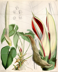 Terrestrial or epiphytic herb, erect or sometimes creeping, attainig 8 m in length. Stems cylindrical, 8-10 cm in diameter, producing watery latex when wounded. Cataphylls up to 60 cm long, ...more ↓