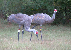 The sandhill crane (Grus canadensis) is a species of large crane of North America and extreme northeastern Siberia. The common name of this bird refers to habitat like that at the Platte River, on the edge of Nebraska's Sandhills on the American Plains. This is the most important stopover area for the nominotypical subspecies, the lesser sandhill crane (Grus canadensis ...more ↓