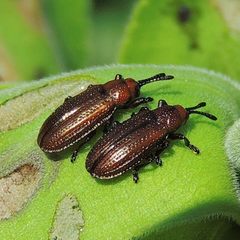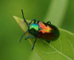 Chrysochus auratus, or the dogbane beetle of eastern North America, is a member of the insect subfamily Eumolpinae. It is primarily found east of the Rocky Mountains One of the brightest in its family, it is iridescent blue-green with a metallic copper, golden or crimson shine. Its diet consists of dogbane and milkweed. It measures between 8 and 11 mm (less than 0.5 ...more ↓