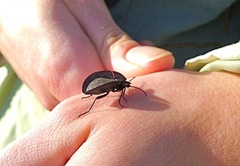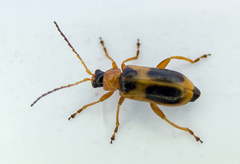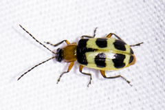 The spotted cucumber beetle (Diabrotica undecimpunctata) is a major agricultural pest insect of North America (see also cucumber beetle). In the adult form, it eats and damages leaves of many crops, including cucumbers, soybeans, cotton, beans, and many others. In the larval form, which is known as the southern corn rootworm, it tunnels through the roots of young ...more ↓