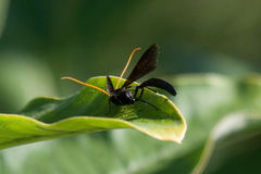 Pelecinus polyturator is a large (up to 7 cm) glossy black wasp, the most common and familiar species in the family Pelecinidae. The adults drink nectar. They live in crop fields, woods, and suburban gardens throughout North, Central, and South America. Their antennae are long and the females have an elongated, cylindrical, articulated metasoma. They are parasitoids that lay ...more ↓
