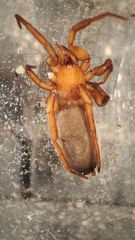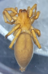 The bowl and doily spider (Frontinella communis) is a species of sheet weaver found in North and Central America. It is a small spider, about 4 mm (0.16 in) long, that weaves a fairly complex sheet web system consisting of an inverted dome shaped web, or "bowl", suspended above a horizontal sheet web, or "doily", hence its common name. The spider hangs from the underside of the ...more ↓