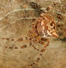 Cyclosa conica is a small spider with no common name. It is an orb weaver, and it is easily recognized by the way it strings together the dead bodies of insects and other debris and hangs it near the center of its web. It hides on this string of debris, and its natural coloration makes it extremely difficult to see until it moves. One of its defenses against predators is to ...more ↓