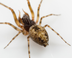 Neoscona arabesca is a common orb-weaver spider found throughout the United States and Canada. Often called the "arabesque orbweaver," after the cryptic, brightly-colored, swirling markings on its prominent abdomen, this spider can be found in fields, forests, gardens, and on human structures. Neoscona species are among the most common and abundant orb weavers and are ...more ↓