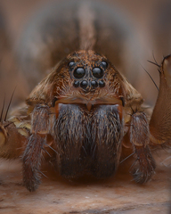 Trochosa ruricola is a wolf spider whose common name is rustic wolf spider. The females are 15 mm (0.6 in) but can reach 25 mm (1.0 in), and the males are 10 mm (0.4 in). Both sexes are dark brown and have a pale band that runs down to the carapace and continues to the abdomen.