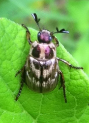 The Oriental beetle (Anomala orientalis, not to be confused with the Japanese beetle) is a beetle about 0.7 - 1.1 cm (0.3 - 0.4 inches) long, with mottled, metallic brown- and black-colored elytra and a similarly-colored thorax and head during the adult stage. During the larval stage the oriental beetle can be identified by the parallel line raster pattern. It is native to Asia ...more ↓