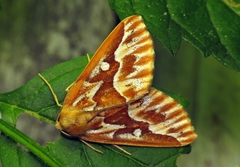 The Meal Moth (Pyralis farinalis) is a cosmopolitan moth of the family Pyralidae. Its larvae (caterpillars) are pests of certain stored foods, namely milled plant products.