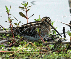 Wilson's Snipe (Gallinago delicata) is a small, stocky shorebird. This species was formerly considered to be a subspecies of the Common Snipe, G. gallinago. Wilson's Snipe differs from the latter species in having a narrower white edge to the wings, and eight pairs of tail feathers instead of seven. Its common name commemorates the American ornithologist Alexander ...more ↓