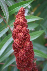 The Staghorn Sumac (Rhus typhina, synonym: R. hirta) is a deciduous shrub to small tree in the Anacardiaceae or Cashew family, native to eastern North America. It is primarily found in Southeastern Canada, the Northeastern and Midwestern United States, Southern Ontario, and the Appalachian Mountains.