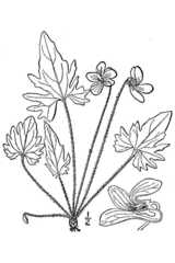 This perennial wildflower consists of a rosette of low basal leaves about 4-7" across, from which several flowering stalks develop. The blades of the basal leaves are 1½-3" long and similarly across; in outline, they are oval, orbicular, or orbicular-reniform. Early leaf blades usually lack lobes, while later blades have 3-5 major lobes and sometimes smaller secondary lobes. These palmate ...more ↓