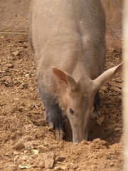 The Aardvark (Orycteropus afer) (afer: from Africa) is a medium-sized, burrowing, nocturnal mammal native to Africa. It is sometimes called "antbear", "anteater", "Cape anteater" (after the Cape of Good Hope), "earth hog" or "earth pig". The name comes from the Afrikaans/Dutch for "earth pig" or "ground pig" (aarde earth/ground, varken pig), because early settlers ...more ↓