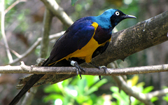 The Golden-breasted Starling, Cosmopsarus regius also known as Royal Starling is a medium-sized, up to 35cm long, passerine in the starling family. The adult has a metallic green head and upperback, bright golden yellow breast and belly, dark bill and legs, white iris and metallic violet blue on wings, back, neck and its long tail feathers. Both sexes are similar. The ...more ↓